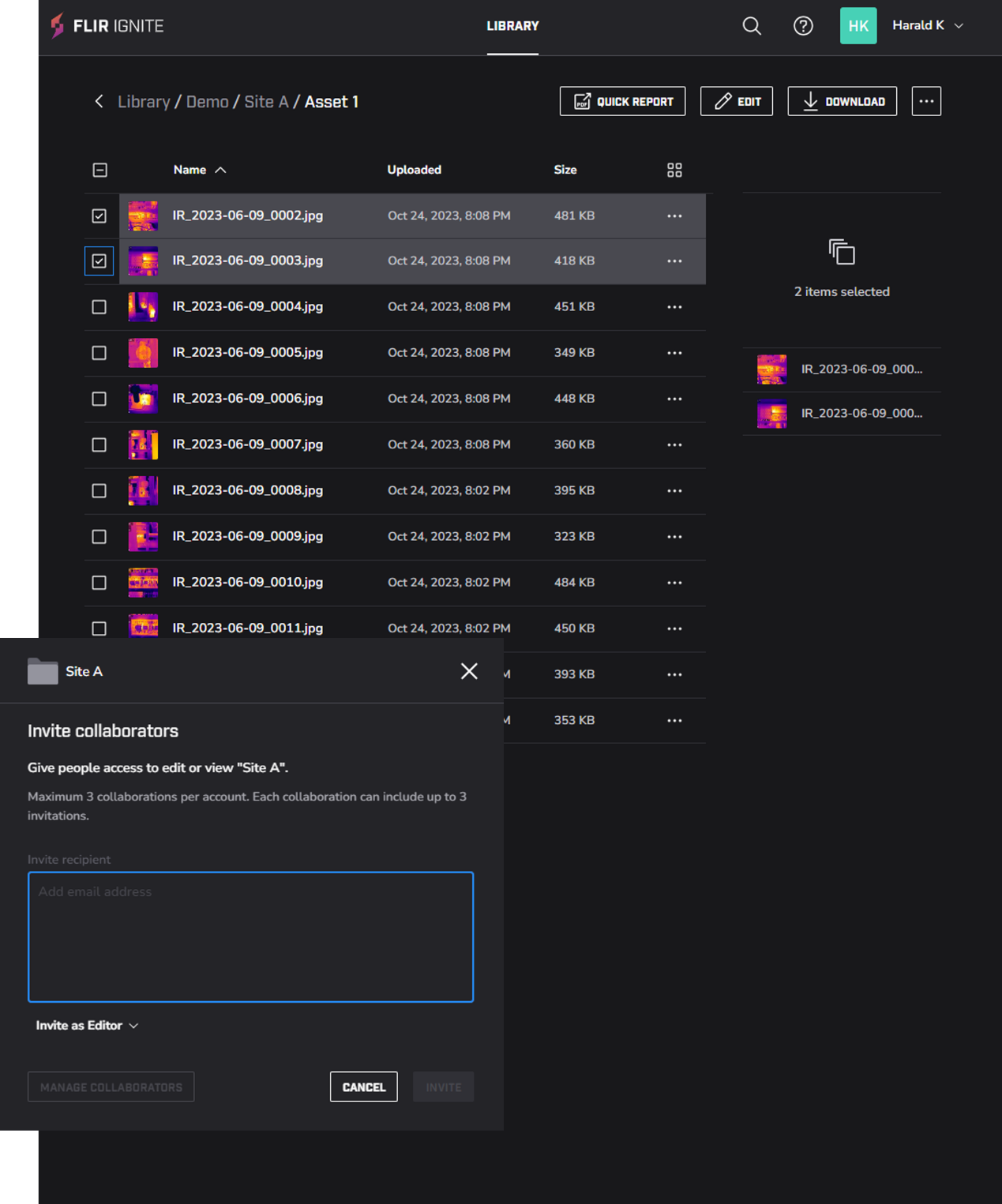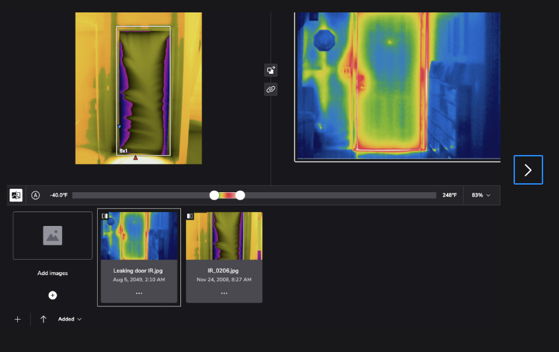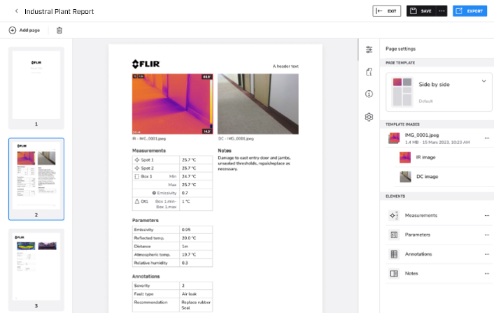 FLIR Ignite 還允許您在現場編輯熱圖像,並將文件移至自訂資料夾以保持井井有條,然後使用受密碼保護的連結與同事和客戶共享發現結果。您甚至可以將文件同步到電腦進行進一步分析,並使用 FLIR Ignite 的整合報告工具產生詳細報告。